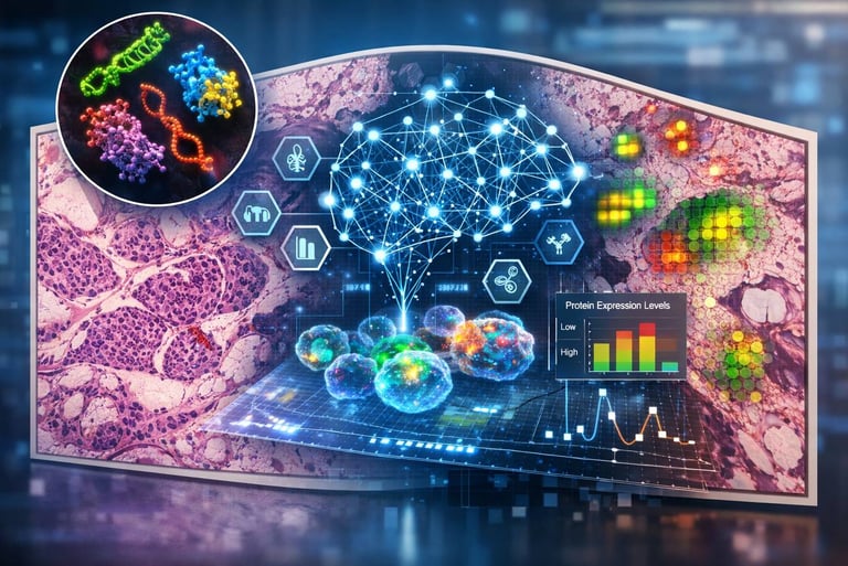 Traditionally, understanding the molecular profile of a tissue—like which proteins are active—requires expensive and time-consuming techniques such as immunohistochemistry or molecular assays. In this study, researchers trained a deep learning model to analyze standard H&E-stained histology slides and predict protein expression patterns directly from the images.